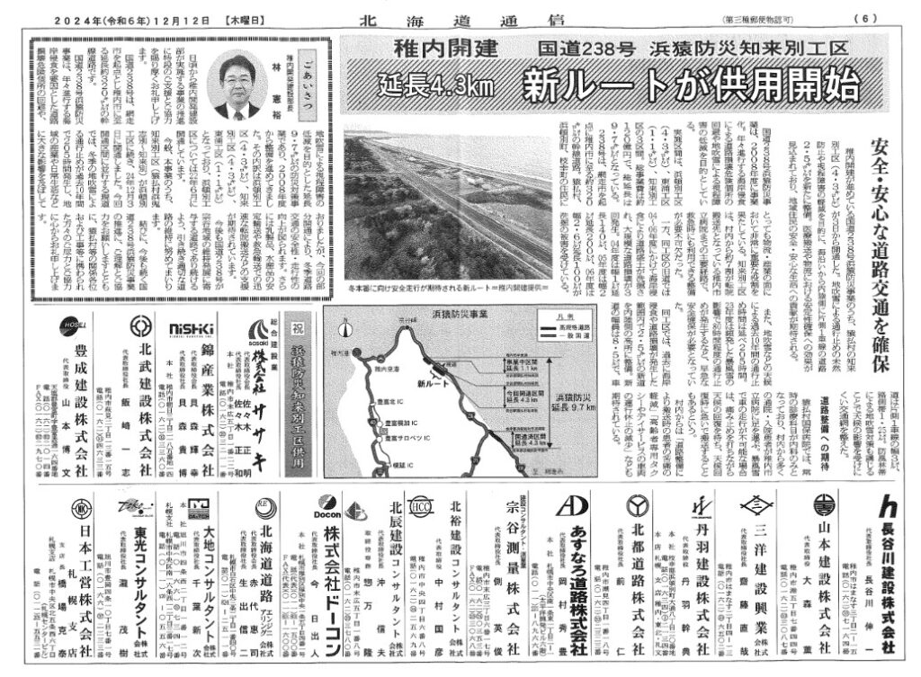 このたび、北都道路株式会社が令和5・6年度に稚内開発建設部より受注した「浜猿(はまさる)防災舗装工事」につきまして、2024年12月3日(火)に無事開通いたしました。